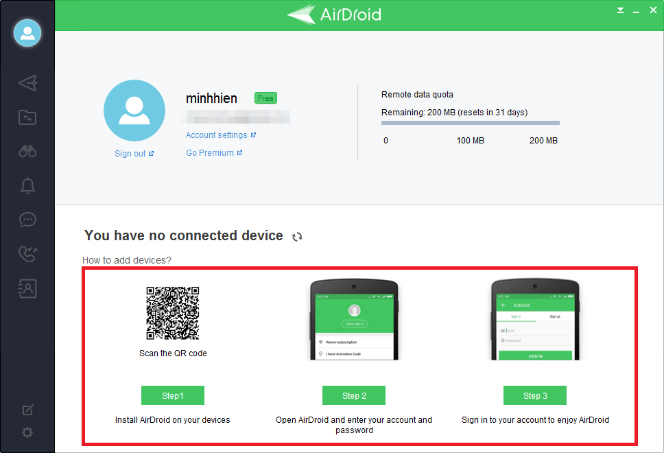 Để kết nối máy tính của bạn với điện thoại thì điện thoại của bạn cũng cần cài ứng dụng AirDroid Desktop đồng thời bạn tạo tài khoản, sử dụng tài khoản đó để đăng nhập đồng thời trên cả điện thoại và máy tính lúc đó phần mềm sẽ đồng bộ dữ liệu giữa cả máy tính và điện thoại của bạn một cách dễ dàng, bạn hoàn toàn có thể sử dụng các ứng dụng như nhắn tin, gọi điện hay tải danh bạ trên máy tính.