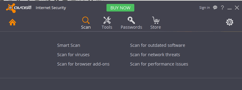 Với Avast bạn có 6 lựa chọn scan khác nhau là Smart Scan, Scan for viruses, Scan for browser add-ons, Scan for outdated software, Scan for network threats, Scan for performance issues