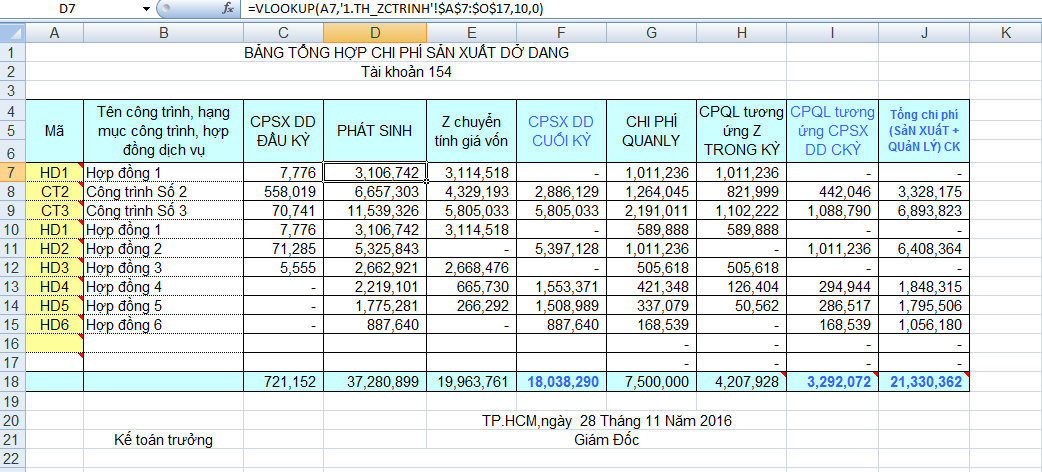 Bảng tính tổng hợp chi phí