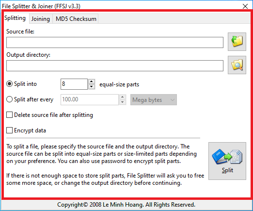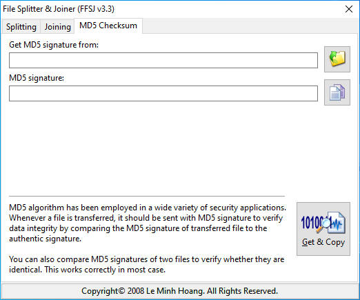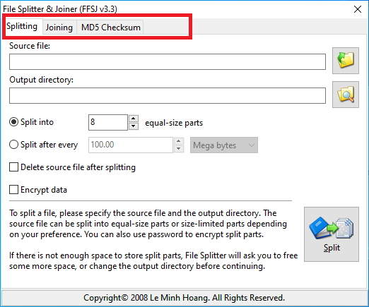Ngoài tính năng tách và ghép file ra thì FFSJ còn cung cấp tính năng kiểm tra mã MD5 - đây là tính năng giúp bạn xem file còn nguyên vẹn và không có sự thay đổi nào với file gốc hay không, đây là tính năng rất quan trọng nếu file của bạn có dung lượng lớn hoặc có nhiều dữ liệu quan trọng.