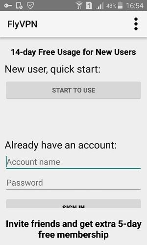 Bước 2: Cài đặt FlyVPN sau đó mở ứng dụng lên, tại giao diện mở ứng dụng bạn click chọn START TO USE (với hệ điều hành Android) và Register new user với hệ điều hành iOS.