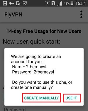 Sau đó FlyVPN sẽ mặc định cung cấp cho bạn một tài khoản (Account name và Password) hiển thị phía dưới, bạn cần lưu lại user và mật khẩu này để lát nữa chúng ta sẽ sử dụng. Việc tiếp theo của bạn là click vào USE IT để chấp nhận sử dụng tài khoản mà FlyVPN đã cung cấp. Trường hợp bạn thấy tài khoản đó khó nhớ quá bạn click vào CREATE MANUALLY để khởi tạo một tài khoản mới của riêng bạn.