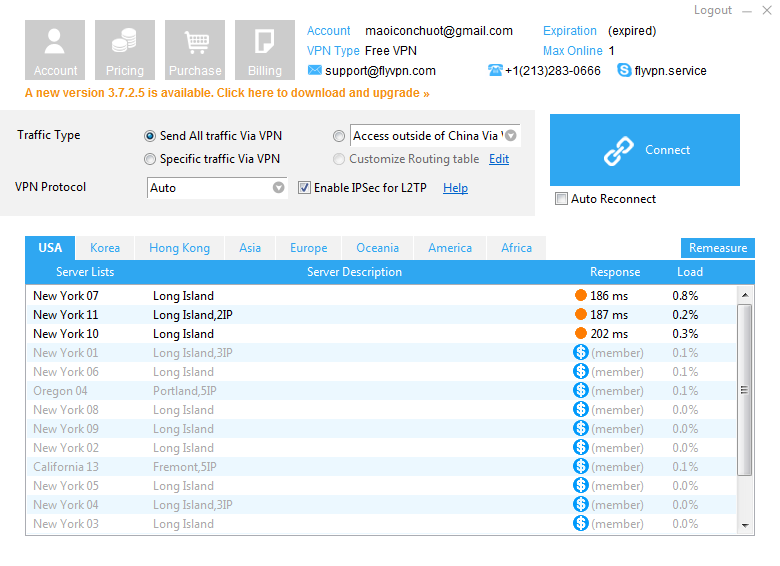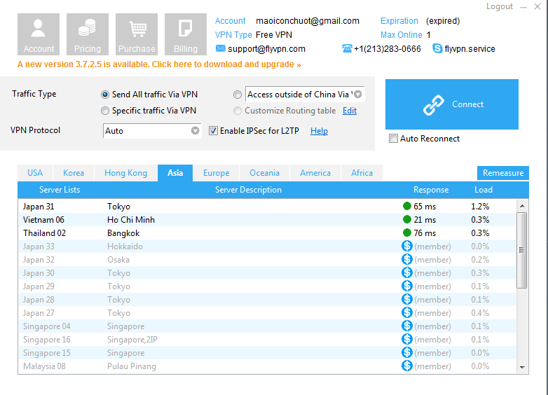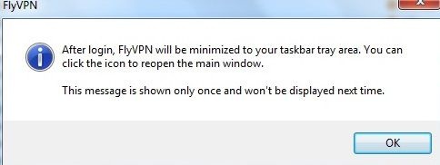 Khi bạn đã cài đặt xong, icon FlyVPN xuất hiện tại màn hình Desktop, bạn mở FlyVPN lên sau đó nhập username và mật khẩu đã lưu tại bước 2, dưới đây là giao diện của FlyVPN khi bạn đăng nhập thành công.
