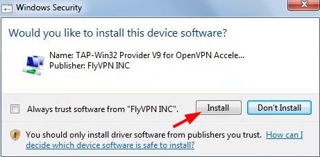 Tại cửa sổ tiếp theo FlyVPN yêu cầu bạn cài đặt ứng dụng hỗ trợ trong lần đầu bạn sử dụng, click Install để cài đặt.