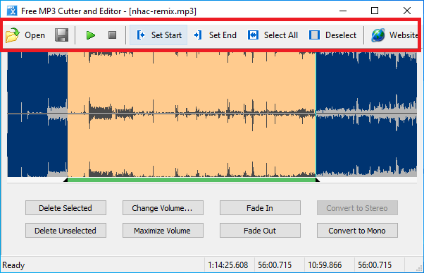 Thanh công cụ trên Free MP3 Cutter and Editor đơn giản, dễ sử dụng