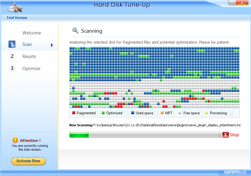 Khi sử dụng Hard Disk Tune Up sẽ tiến hành quét toàn bộ ổ cứng sau đó đưa ra kết quả để người dùng biết từng phân vùng cụ thể có trong ổ cứng của bạn, đồng thời chống phân mảnh để giúp ổ cứng của bạn hoạt động được hiệu quả hơn.