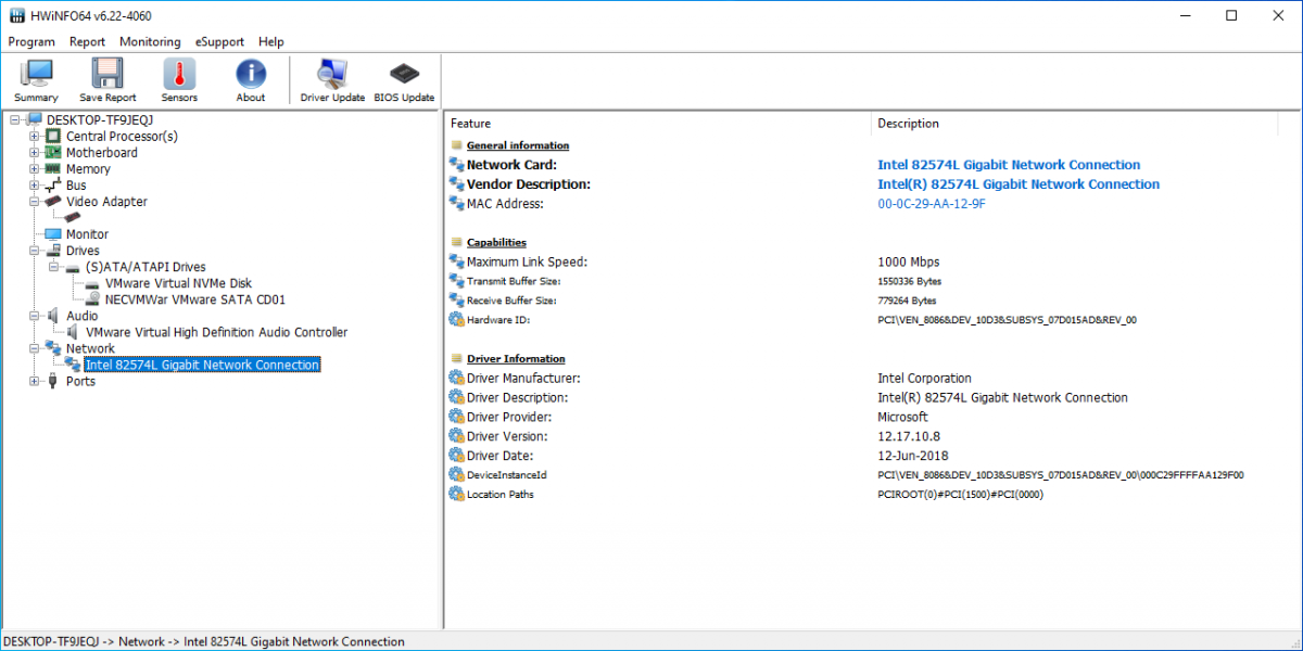 - Thông tin mạng chung, bao gồm địa chỉ MAC, chi tiết trình điều khiển và thông tin nhà cung cấp, tốc độ tối đa và kích thước bộ đệm.