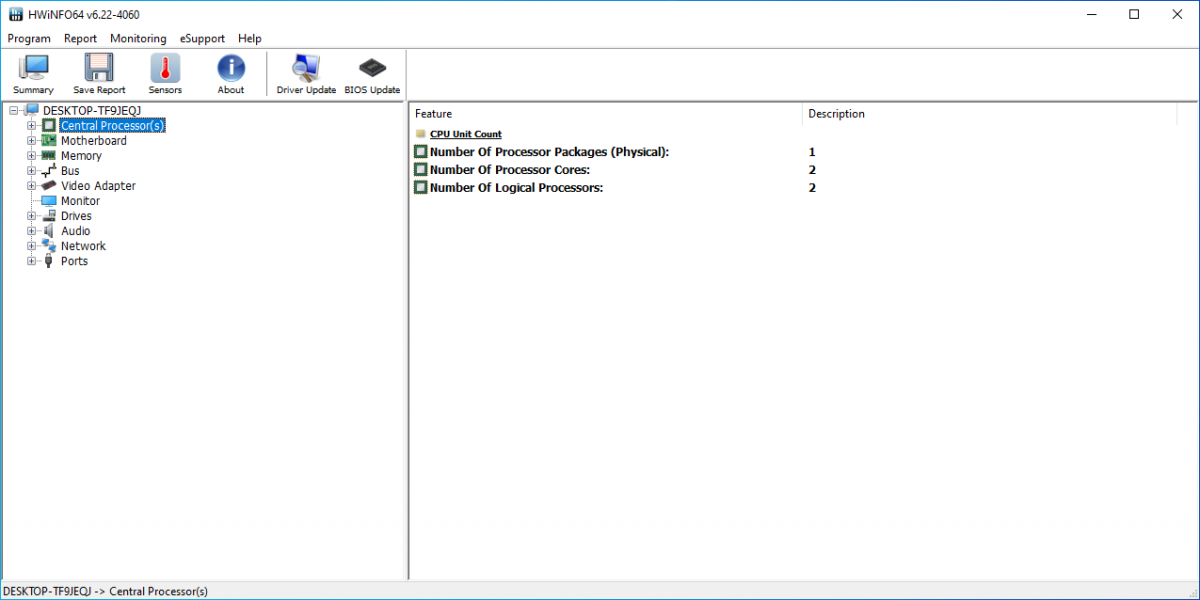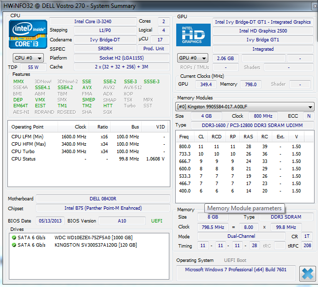 - Nhà sản xuất bộ xử lý, phiên bản, tốc độ đồng hồ hiện tại và tối đa, điện áp và socket.