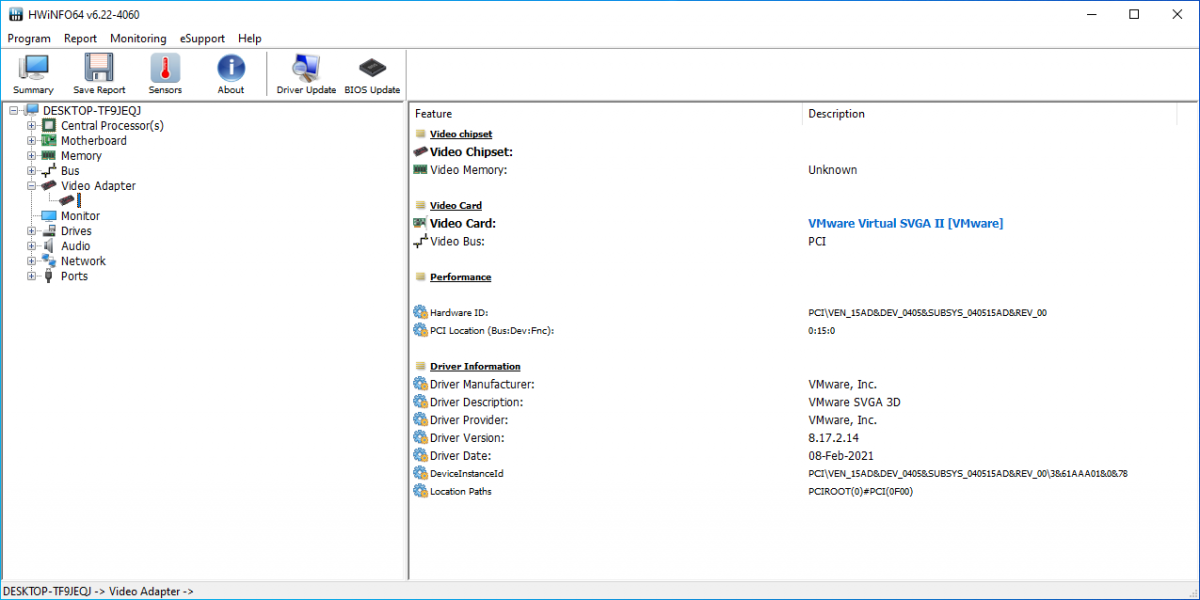 - Thông tin video chipset, chẳng hạn như tên mã và bộ nhớ; thông tin BIOS và thông số của chipset; thông tin hiệu suất, chẳng hạn như bộ vi xử lý và tốc độ bộ nhớ, độ rộng của bus và thông tin trình điều khiển, chẳng hạn như nhà sản xuất, số phiên bản, ngày và ID thể hiện.