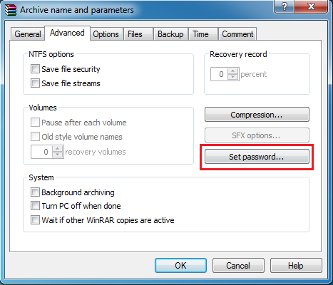 Để đặt mật khẩu cho file nén bằng winrar tại tab Advanced bạn chọn Set password, khi click vào sẽ xuất hiện khung Enter password