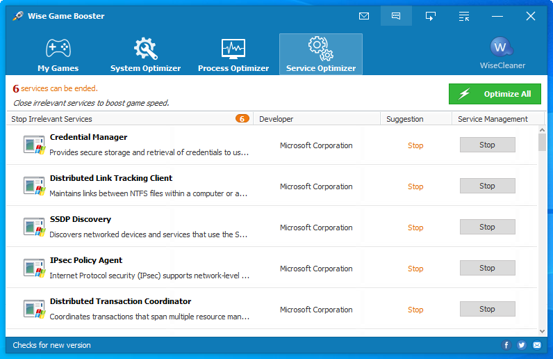 Được tích hợp công cụ System Optimizer dùng để quét tự động các phần mềm hoạt động trong máy tính, Wise Game Booster sẽ thông báo tới người dùng các phần mềm đang hoạt động để người dùng có thể tắt tự động hoặc thủ công, người dùng cũng có thể khôi phục hoạt động của các phần mềm đã tắt mà không hề ảnh hưởng tới chúng.