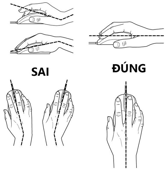 Giữ tay và chuột thẳng theo một hàng, cổ tay không được cong quá lên trên hoặc sáng trái, sang phải, điều này sẽ làm các khớp trên cổ tay của bạn bị mỏi.