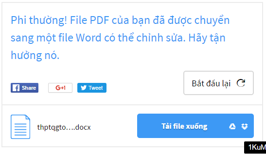 Như vậy là bạn đã chuyển xong file PDF sang word rồi đấy, việc tiếp theo bạn làm chỉ cần click vào "Tải file xuống" rồi thưởng thức thành quả thôi. Mặc định website sẽ chuyển cho bạn sang file .docx và để đọc được file .docx thì bạn cần phải cài đặt office 2007 trở lên nhé, office 2003 chỉ hỗ trợ file .doc thôi.