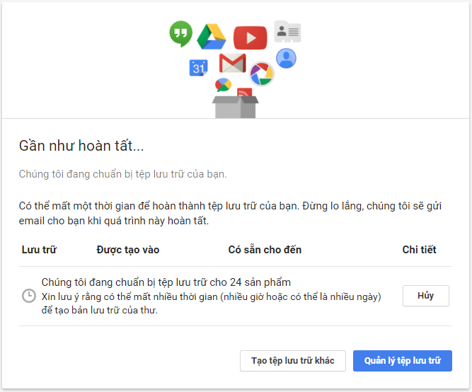 Bước 6: Google sẽ tiến hành backup cho bạn, quá trình này có thể mất thời gian tùy thuộc vào lượng dữ liệu tài khoản Google của bạn có. Sau khi quá trình backup hoàn tất email của bạn sẽ nhận được link download phiên bản backup