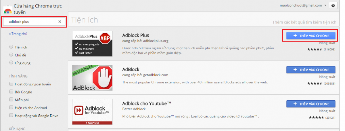 Bước 3: Tại ô tìm kiếm bạn gõ adblock plus, sau khi tìm thấy tiện ích Adblock Plus bạn click THÊM VÀO CHROME