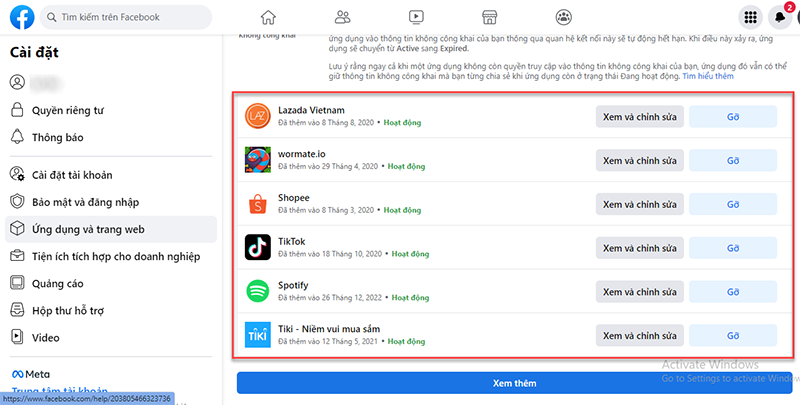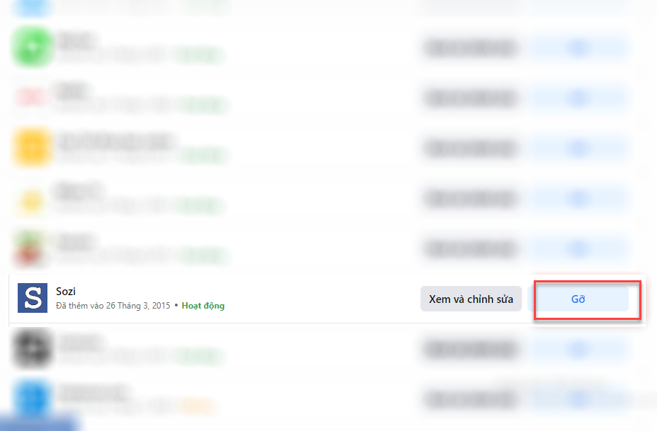 Bước 4: Danh sách các ứng dụng mà bạn đã cài đặt trên tài khoản Facebook của bạn sẽ hiển thị. Tìm ứng dụng mà bạn muốn gỡ bỏ và nhấp vào nó.