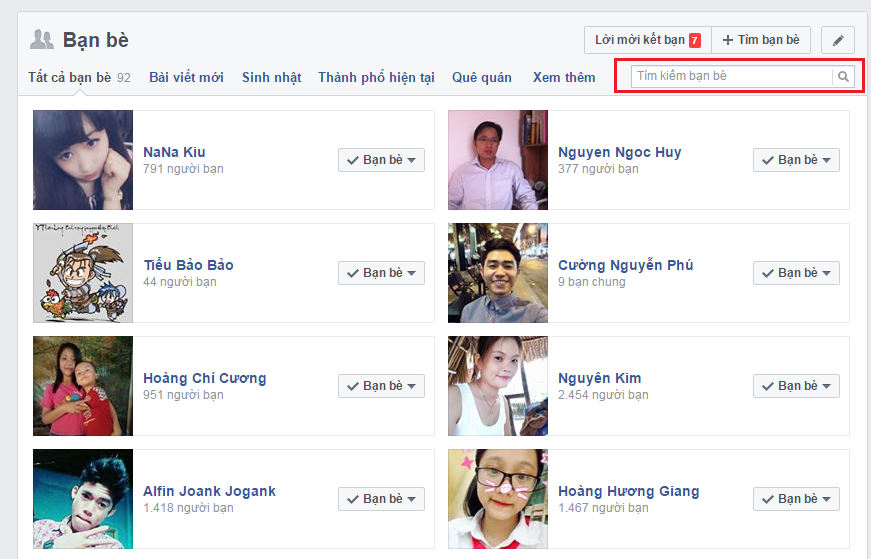 Bước 3: Bạn sẽ thấy hiển thị danh sách bạn bè của bạn, nếu bạn muốn tìm nhanh tên của một người nào đó bạn có thể nhập vào ô Tìm kiếm bạn bè