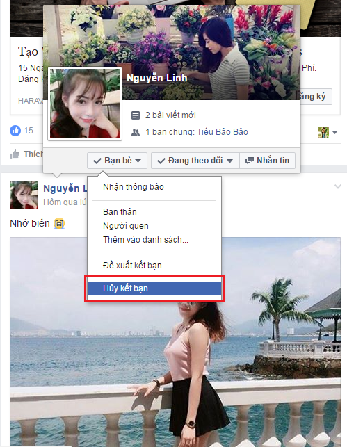 Cách này đơn giản hơn cách thứ nhất, khi bạn thấy chia sẻ trên Facebook bạn chỉ việc di chuột tới tên của người đó, sau đó di chuột tới Bạn bè và chọn Hủy kết bạn