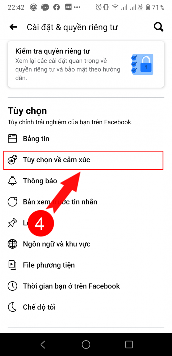 Bước 3: Bạn click tiếp vào phần Cài đặt (số 3) sau đó kéo xuống dưới và ấn tiếp vào phần Tuỳ chọn về cảm xúc (hình 4)