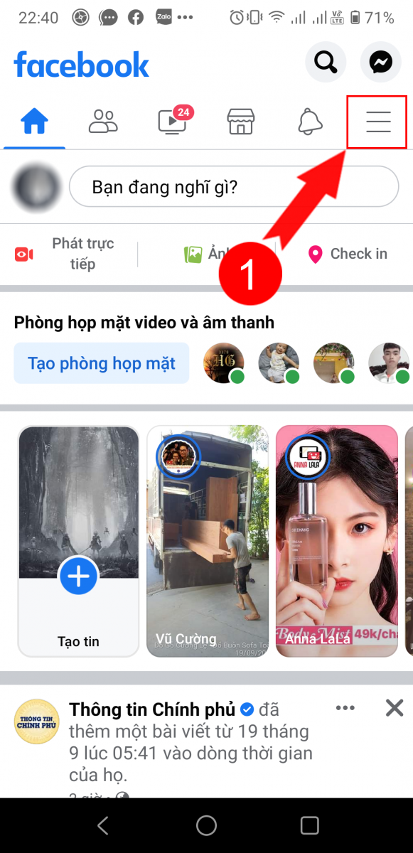 Bước 1: Bạn mở Facebook trên điện thoại của bạn lên sau đó bạn click vào biểu tượng 3 sọc ngang (biểu tượng menu của facebook) nằm ở trên cùng bên phải (số 1).