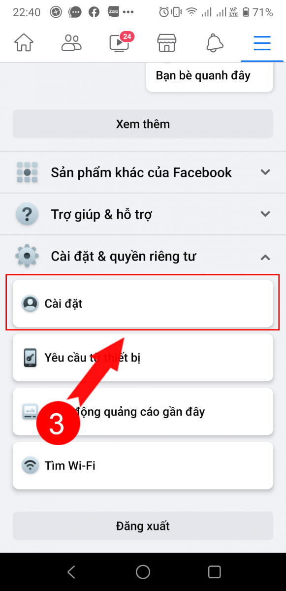 Bước 2: Sau đó bạn sẽ được chuyển sang một giao diện mới bạn kéo màn hình xuống dưới và click vào phần Cài đặt & quyền riêng tư (số 2)
