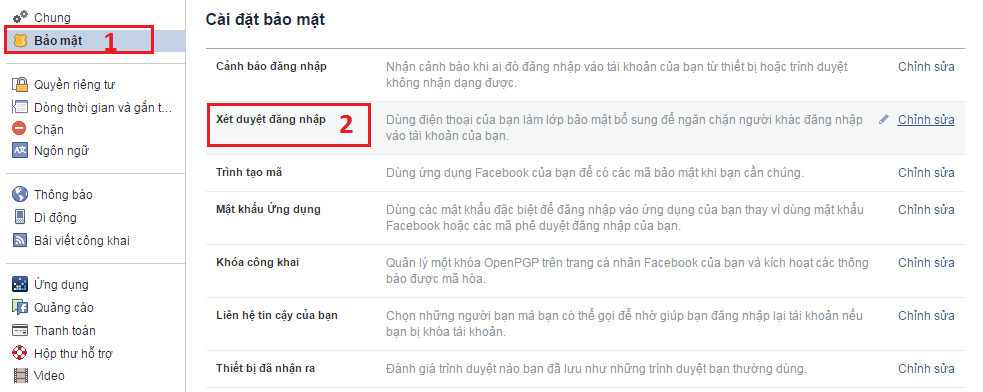 Bước 5: Sau khi đã thêm số điện thoại vào tài khoản Facebook của bạn rồi, bạn click Bảo mật >> Xét duyệt đăng nhập