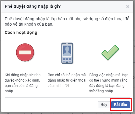 Bước 6: Tích chọn Yêu cầu mã đăng nhập để truy cập tài khoản của tôi từ trình duyệt không xác định sau đó click Bắt đầu