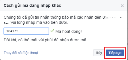 Bước 8: Facebook sẽ gửi tin nhắn có mã xác nhận tới số điện thoại bạn vừa đăng ký ở bước trên, nhập mã vào rồi nhấn Tiếp tục