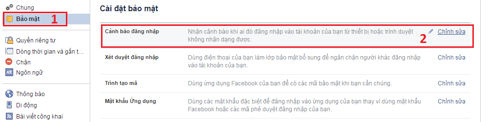 Bước 2: Bạn chọn Bảo mật sau đó chọn Cảnh báo đăng nhập