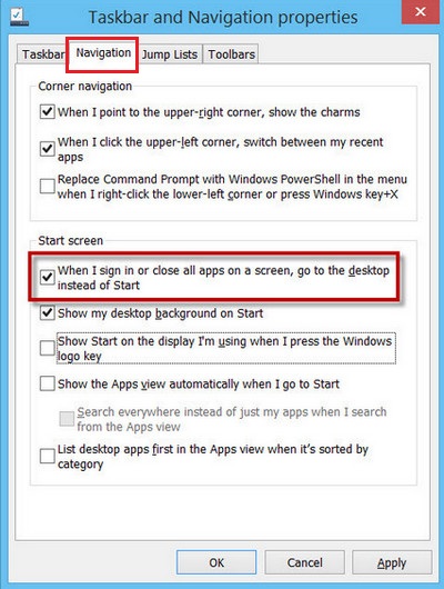 Bước 2: Tại cửa sổ Taskbar and Navigation properties bạn chọn tab Navigation, tại phần Start screen bạn tích tại ô When I sign in or close all app on a screen, go to the desktop instead of Start