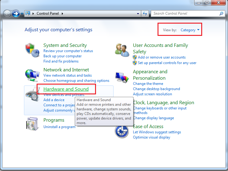 Bước 3: Chọn chế độ xem view by Category sau đó chọn Hardware and Sound