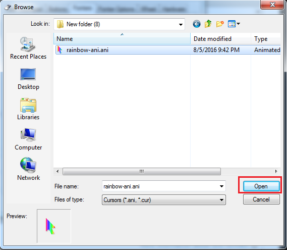 Bước 6: Tìm đến file có định dạng *.ani hoặc *.cur mà bạn vừa download phía trên về (ở bước 1) sau đó click Open