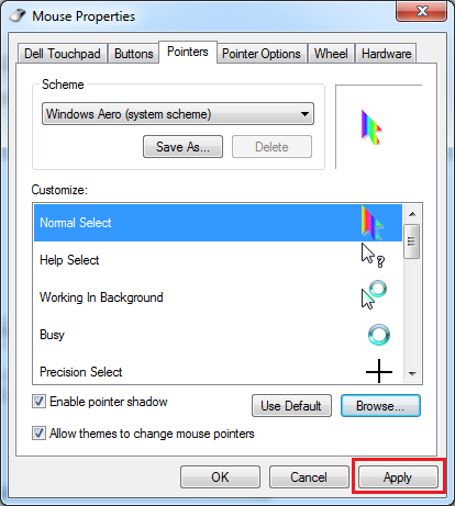 Bước 7: Bạn sẽ nhìn thấy hình ảnh demo con trỏ chuột của bạn như hình phía dưới, click Apply để đồng ý áp dụng thay đổi con trỏ chuôt.