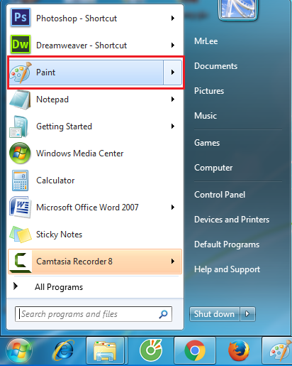 Bước 3: Bạn click vào Start -> chọn Paint (nếu không thấy Paint bạn có thể vào Start >> All Programs >> Accessories >>Paint)