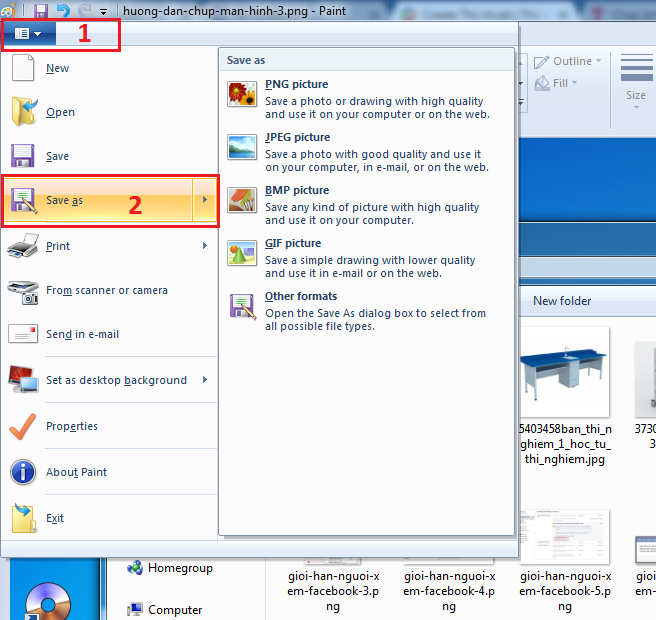 Bước 5:Bạn click vào biểu tượng như hình dưới (1) sau đó chọn Save as(2) để lưu lại bức ảnh là xong