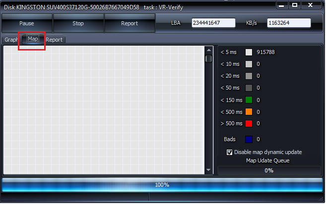 Bước 5: Cửa sổ check ổ cứng sẽ hiển thị, bạn click sang tab Map để xem tiến trình, màu sắc của ô sẽ thể hiện tình trạng ổ của bạn, nếu hiển thị màu xanh là vùng đó đã bị Bads còn màu đỏ là nguy hiểm... Như trong hình dưới ổ cứng của mình hoàn toàn bình thường.