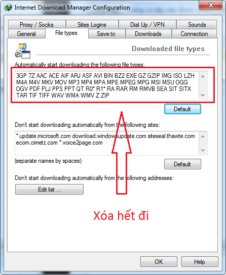 Cách 3: Làm theo cách 1 tuy nhiên tại tab File Types bạn chọn Edit list, click vào Add để bổ xung địa chỉ website mà bạn không muốn IDM tự động bắt link.