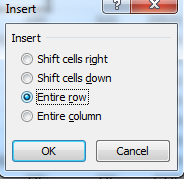 Bạn chọn Entire row nếu muốn thêm hàng (hàng sẽ thêm vào phía trên ô đa chọn) hoặc Entire column nếu muốn thêm cột (cột sẽ thêm vào bên trái ô đã chọn)