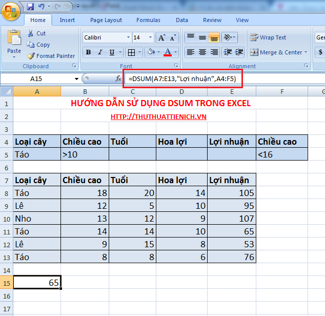 Để tính tổng lợi nhuận của những cây táo có chiều cao lớn hơn 10 bằng cách sử dụng hàm DSUM, tại ô A15 chúng ta gõ công thức =DSUM(A7:E13,"Lợi nhuận",A4:F5)