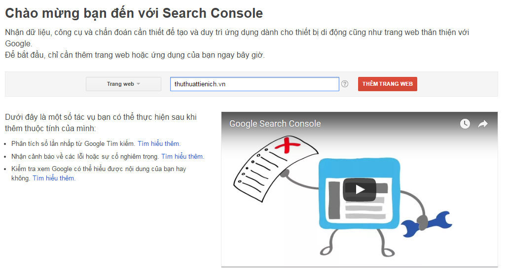 Tiếp theo bạn đăng nhập vào tài khoản Google sau đó truy cập vào đây, điền tên trang web như hình dưới >> click Thêm Trang Web