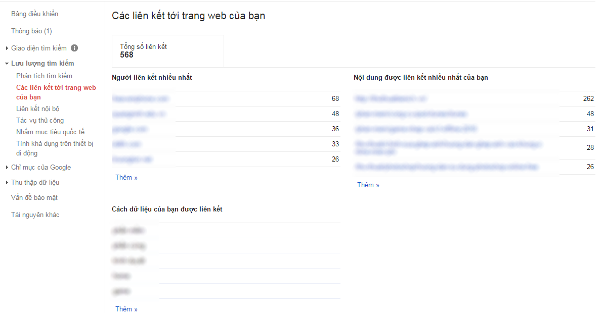 Phần này sẽ thống kê tất cả các backlink về website của bạn (không hiểu sao các backlink thống kê tại đây mình so sánh với thống kê tại ahrefs thì luôn thấp hơn). Các thống kê tại mục này hết sức quan trọng trong trường hợp website của bạn nếu có bị Google phạt bạn có thể xem tại đây và lọc ra các backlink cần thiết sau đó tiến hành chặn backlink để nhanh chóng thoát khỏi án phạt của Google.