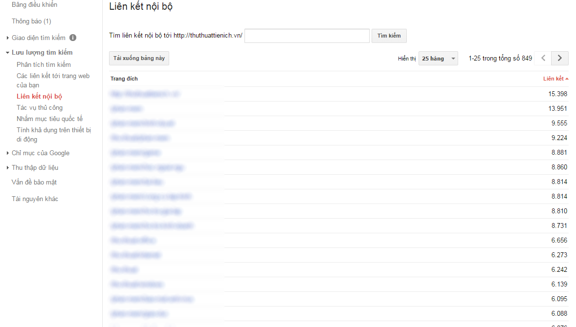 Phần này sẽ thống kê các liên kết nội bộ trong website của bạn, giúp bạn có cái nhìn rõ hơn về cấu trúc website mà mình đang quản trị