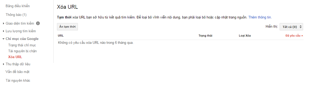 Nếu bạn muốn xóa tạm thời một url nào đó của website hiển thị trên kết quả tìm kiếm của Google, bạn có thể sử dụng chức năng này.