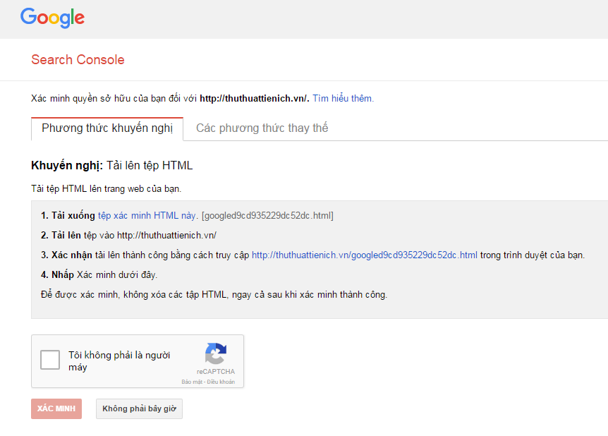 Trong ví dụ này mình sẽ sử dụng phương thức Tải lên tệp HTML. Bạn download file HTML sau đó upload lên thư mục ngoài cùng website của bạn (thường cùng vị trí với file .htaccess)
