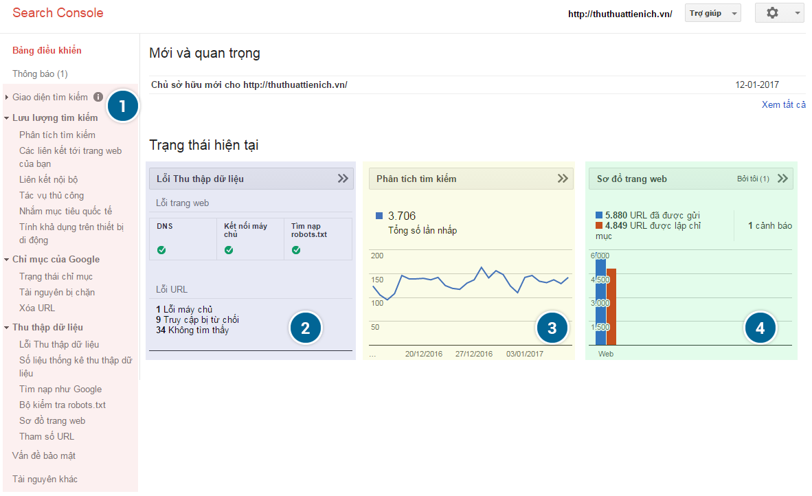 Vùng 1: là menu của Goolgle Webmaster Tools