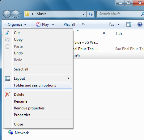 Để hiển thị phần mở rộng của file trong Windows 7 bạn cần mở 1 tệp(fFolder) sau đó click vào Organize -> chọn Folder and search options