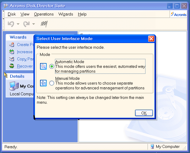 Bạn sẽ được chuyển vào giao diện làm việc của Acronis Disk Director Suite, chọn Automatic Mode