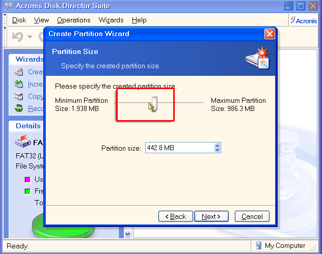 Sử dụng thanh kéo để di chuyển kích thước cần lấy từ phân vùng đó >> Next