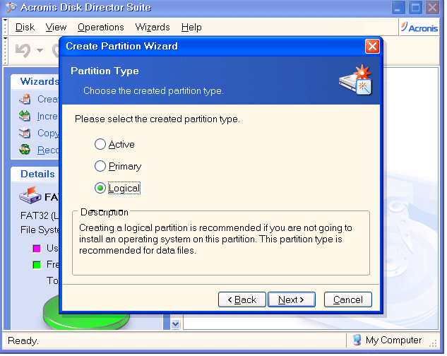 Cửa sổ Create Partition Wizard xuất hiện, bạn lựa chọn loại cho ổ đĩa mới là Active (boot Windows), Primary, Logical >> Next