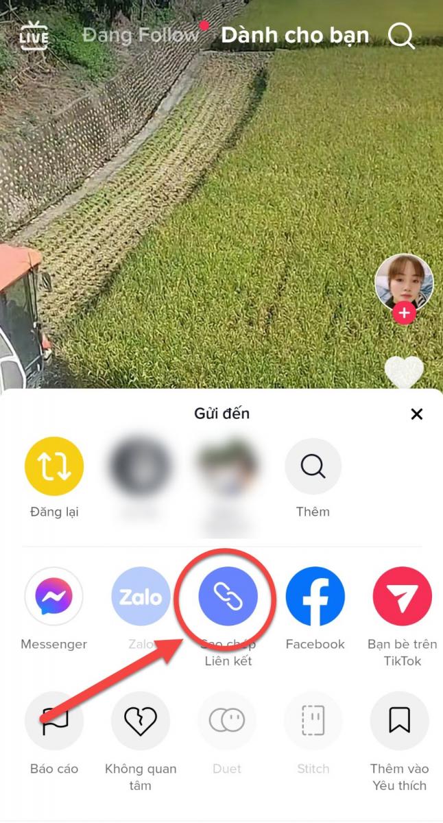 Bước 1: Bạn mở video Tiktok ra sau đó click vào biểu tượng mũi tên, sau đó bạn click vào Sao chép liên kết để lưu url video vào bộ nhớ tạm của máy.